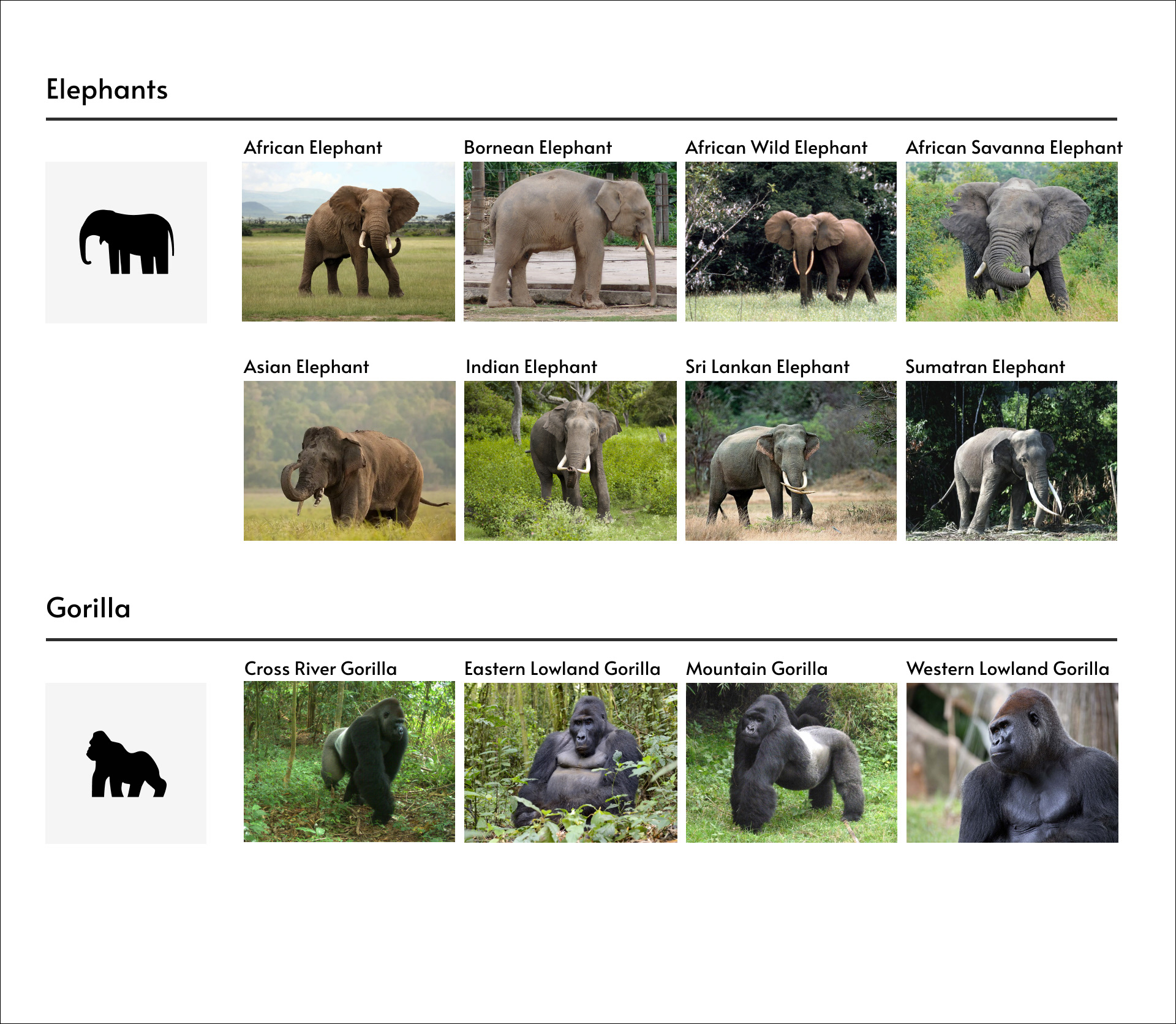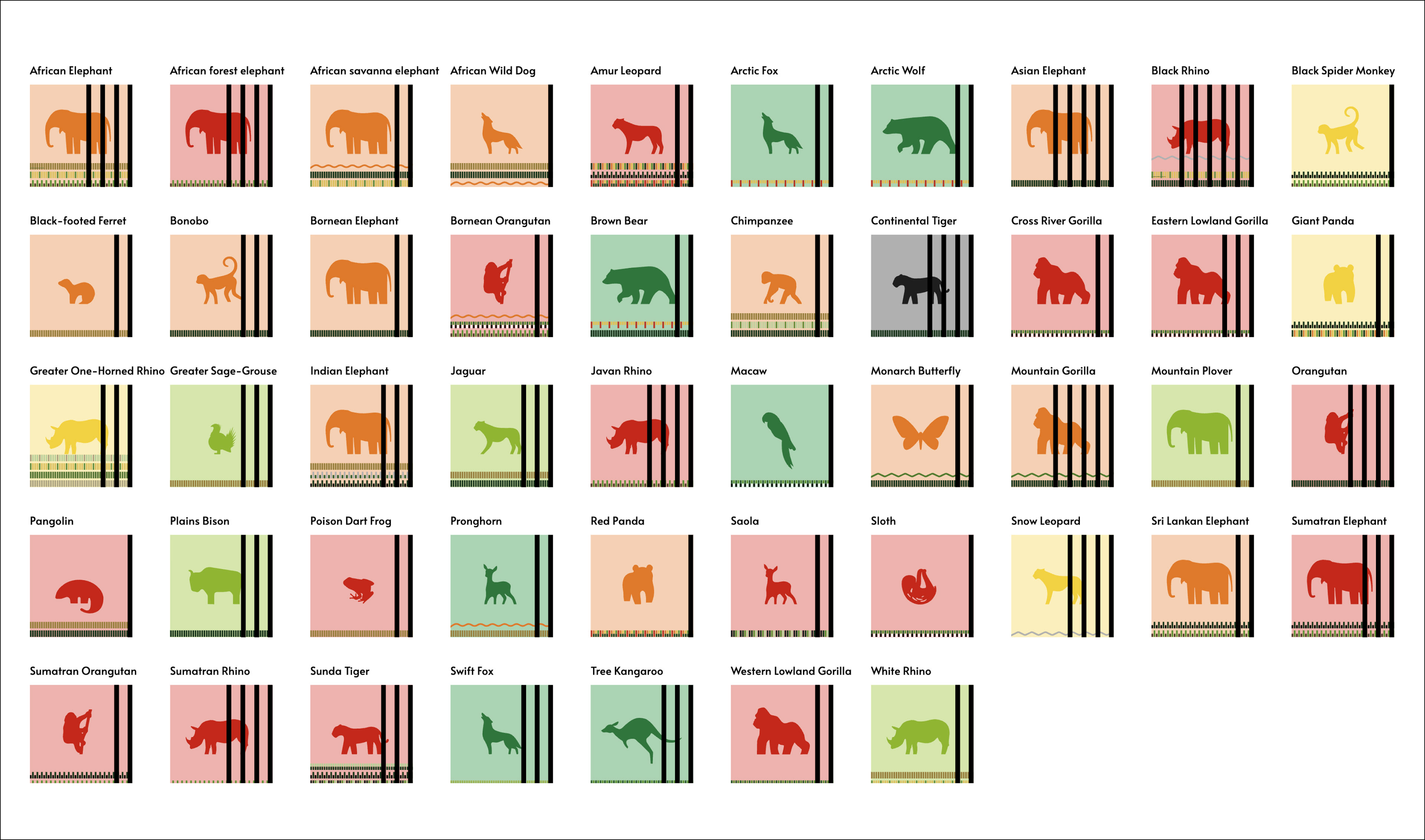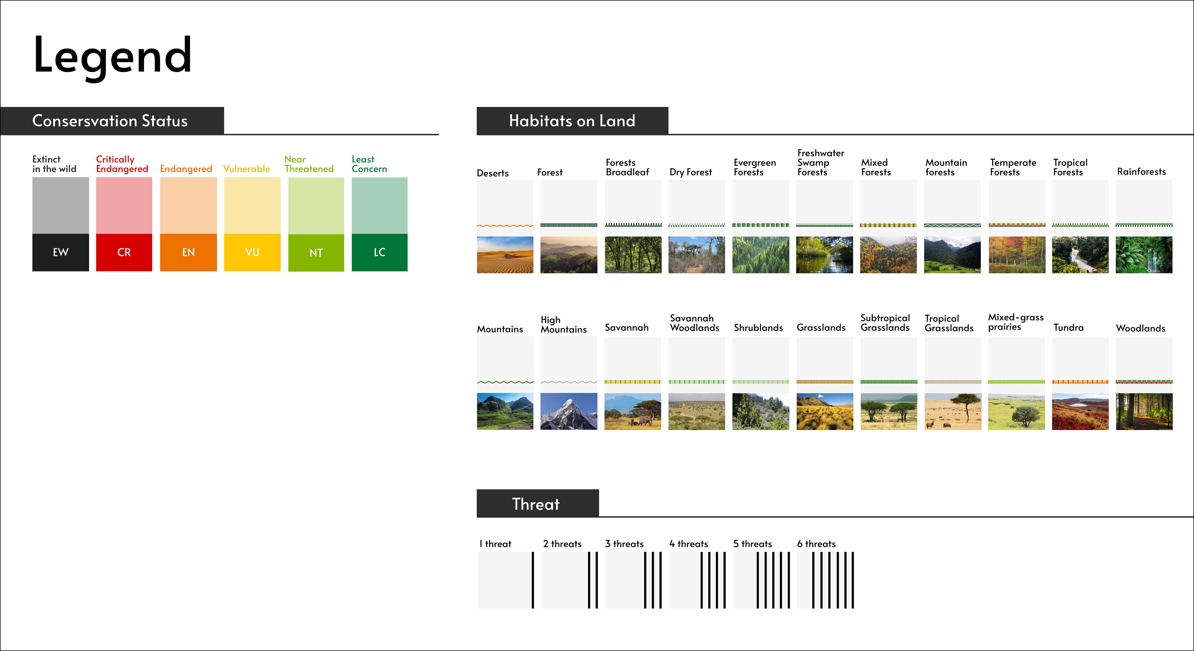 I created a habitat legend using lines and rectangles that can be easily transformed into scalable vector graphics (SVGs). Each habitat was designed based on its natural environment. However, because each animal has a unique appearance, having too many icons can be confusing. To address this, I grouped animals by species. For example, African and Bornean elephants share the same elephant icon, despite differences in ear size. This resulted in a total of 23 SVGs. The use of simple shapes and colors effectively conveys complex information in a clear and visually appealing way.
