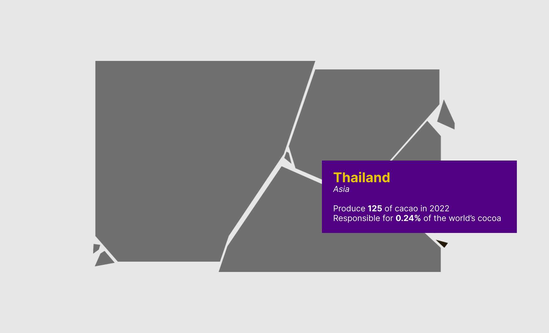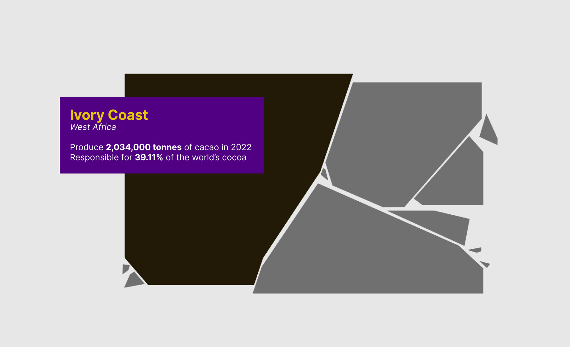 The homepage features a chocolate bar with a moving golden ticket, which prompts the user to click on it. Upon clicking, the ticket comes to the front of the screen and introduces the project. As the user scrolls down, they are presented with a chocolate bar that can be broken into pieces by clicking on it. Each of these pieces represents a cocoa-producing country and is linked to relevant data points. Users can hover over each segment to see more information about the producing country, such as its name, region, the amount of cacao it produces in tonnes, and its contribution to the world's cocoa supply.